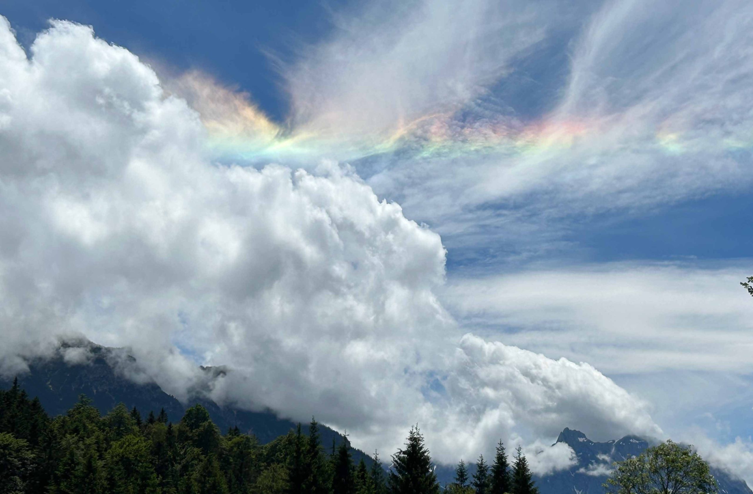Vor kurzem fuhr ich von Garmisch nach Hause. Es war ruhig auf der Straße und ich freute mich über die Frühlingssonne im Karwendel. Dann sah ich diese Wolke. Trotz blauem Himmel der Schimmer der Regenbogenfarben. Ich blieb stehen, um diesen Zauber zu betrachten. Ich versuchte, zu fotografieren. Wie so oft konnte das Bild nur ein Fragment meines Empfindens abbilden. Dennoch erinnert mich das Bild an den Augenblick, in dem ich über das Phänomen des Farbenspiels gestaunt habe und gefreut habe, dass ich dieses Himmelsbild erleben darf. Ganz sicher gibt es naturwissenschaftliche Erklärungen, warum und wieso diese Wokenformationen entstehen. Ich denke dann belustigt an Ludwig Wittgenstein, einen österreichischen Philosophen: „Wir fühlen, dass selbst wenn alle möglichen wissenschaftlichen Fragen beantwortet sind, unsere Lebensprobleme noch gar nicht berührt worden sind.“